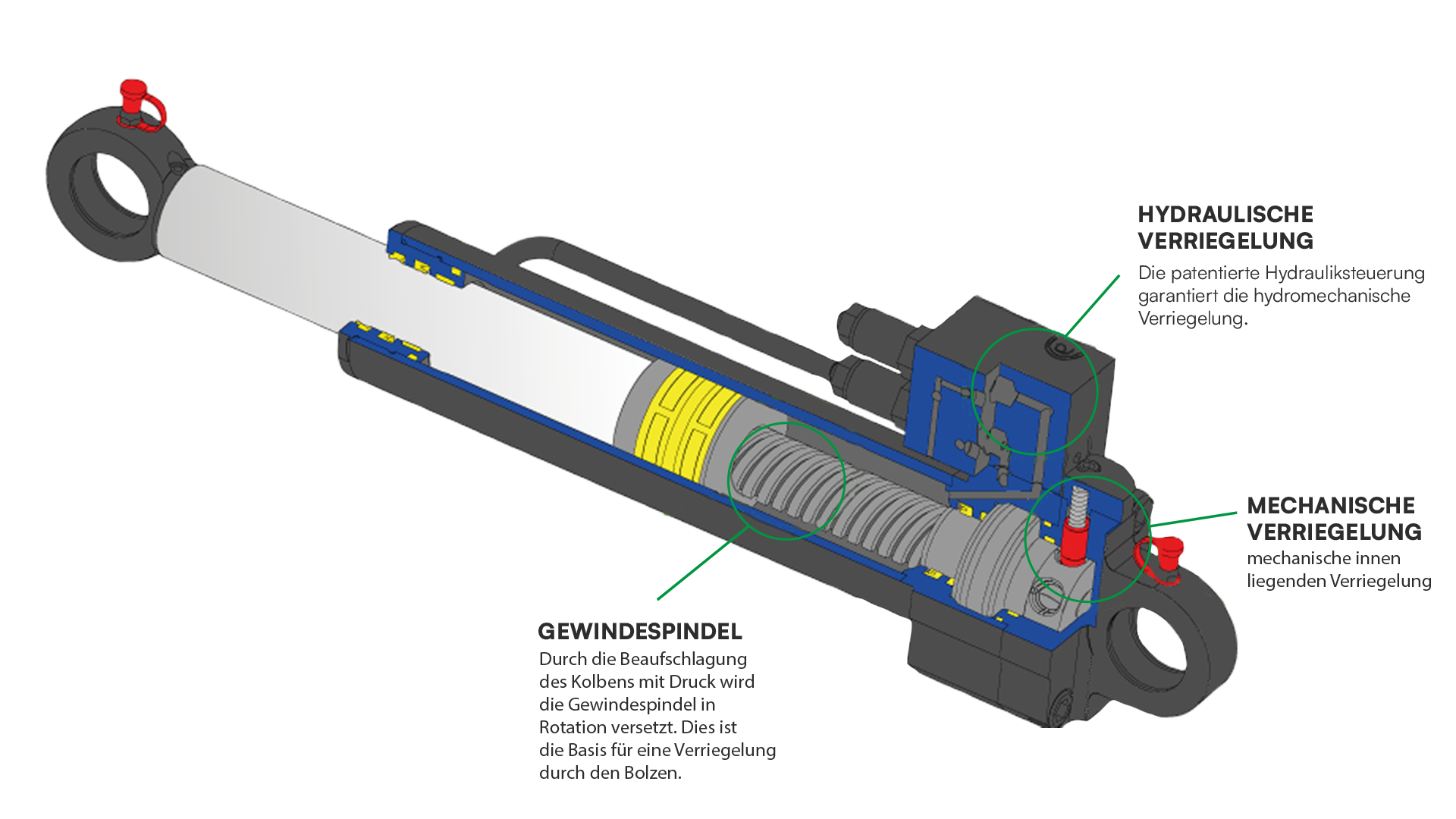 Ein patentierter hydraulischer Verriegelungszylinder, der sowohl eine hydraulische als auch mechanische innen liegende Verriegelung besitzt. Die Besonderheit dieser neuartigen Technologien besteht darin, dass der Zylinder in beide Richtungen sowohl auf Druck als auch auf Zug verriegelt.