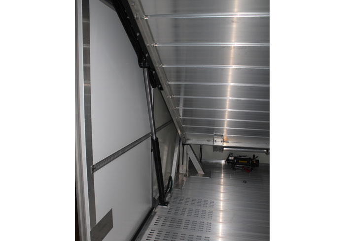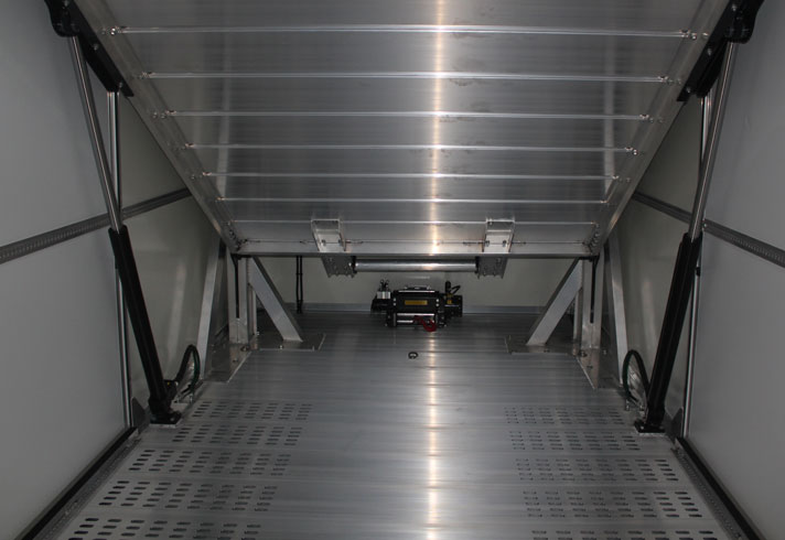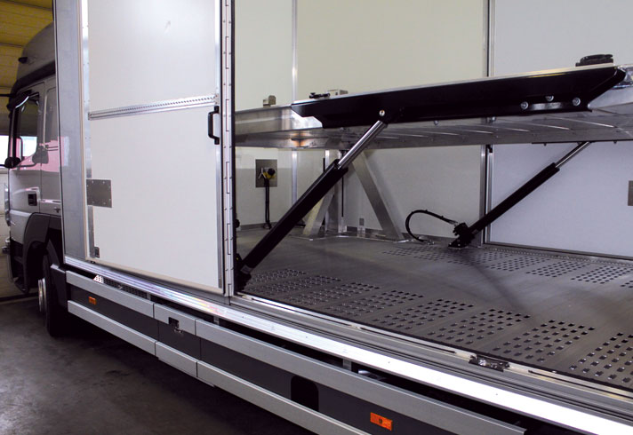 Die folgenden Bilder zeigen einen geschlossenen Doppelstock Aluminium Fahrzeugaufbau der Fa. FGS Systems, in dem Safety Lock zur Lastensicherung des Plateaus seine Anwendung findet.